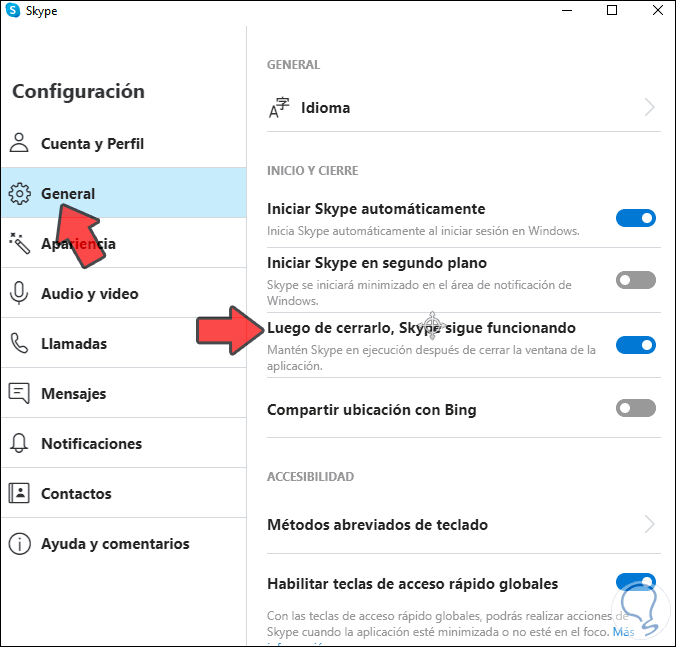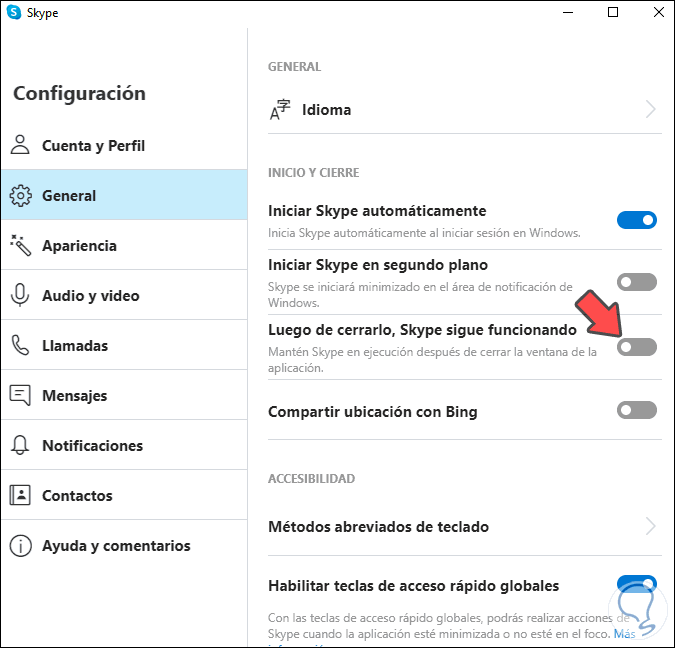 Allí vamos a desactivar el interruptor llamado “Luego de cerrarlo, Skype sigue funcionando”:
