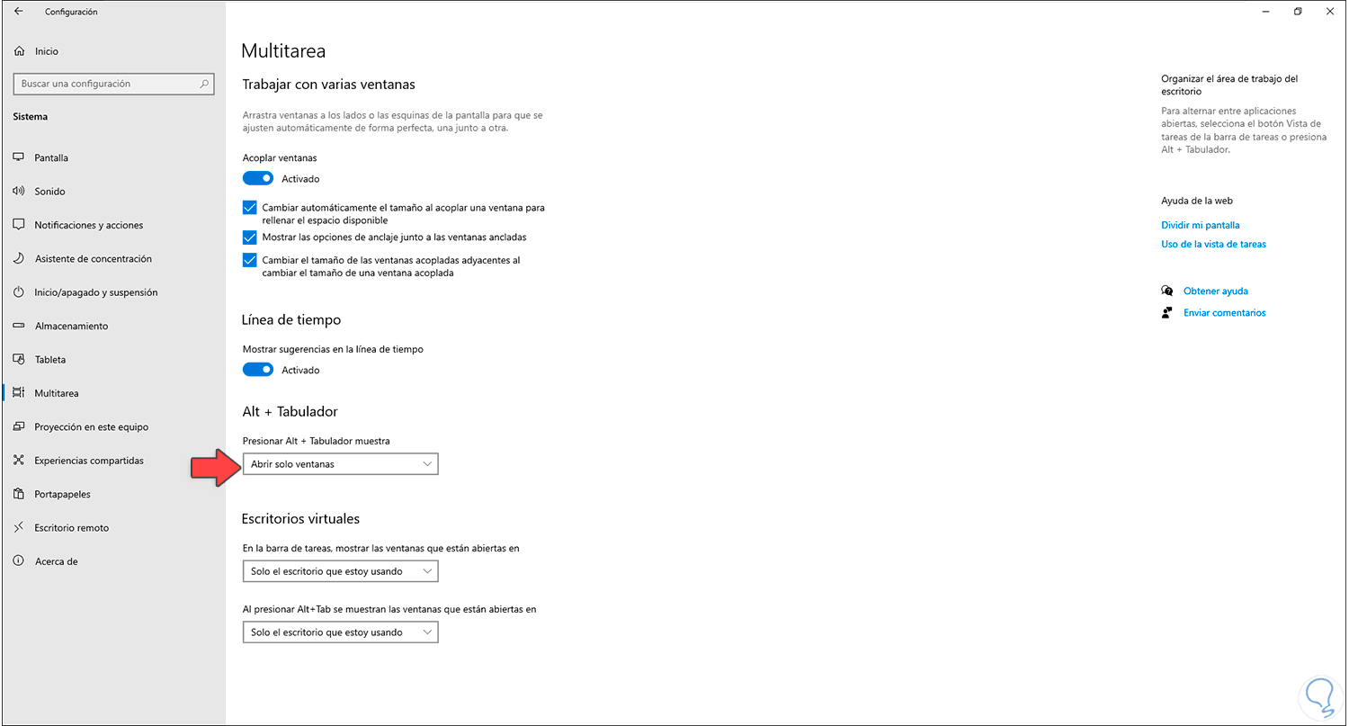 En la sección Alt + Tabulador vemos que por defecto el valor es “Abrir ventanas y todas las pestañas en Microsoft Edge”, damos clic sobre esta opción y ahora seleccionamos “Abrir solo ventanas”: