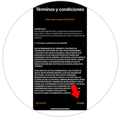 En la siguiente pantalla del iPhone, acepta los términos y condiciones.