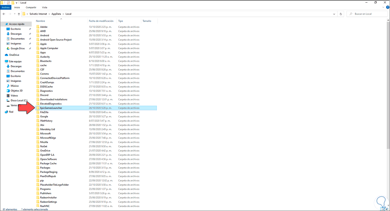 Allí vamos a AppData – Local y seleccionamos la carpeta Epic Games Launcher:
