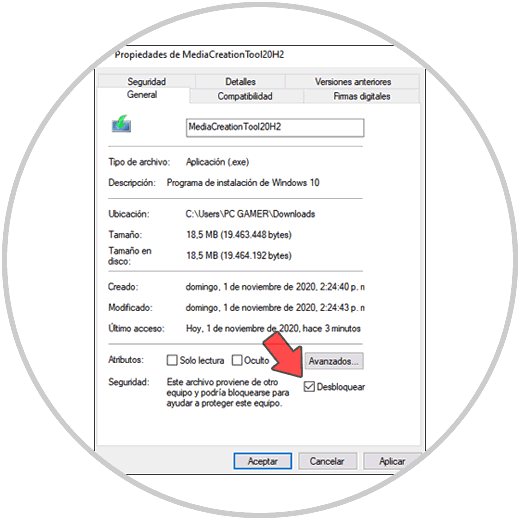 En la ventana desplegada vamos a la pestaña “General” y allí activamos la casilla “Desbloquear” ubicada en la parte inferior. Damos clic en Aplicar y en Aceptar para guardar los cambios.