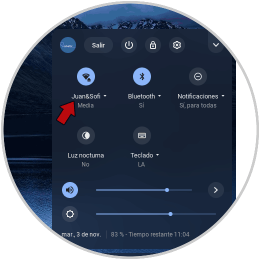 Para iniciar damos clic en “Inicio” en la barra de tareas de Chromebook, allí podemos ver la red activa y a la cual se está conectado: