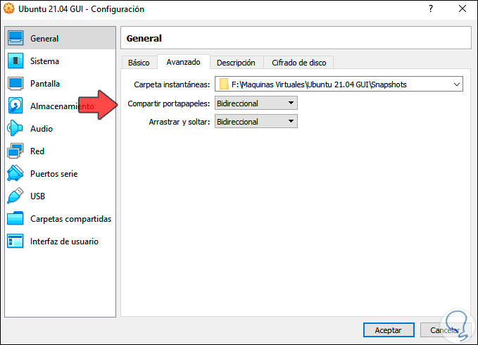 Apagamos la máquina virtual y abrimos su configuración, en la sección “General” iremos a la pestaña “Avanzado” y activaremos la opción “Bidireccional” en los campos “Compartir portapapeles” y “Arrastrar y soltar”: