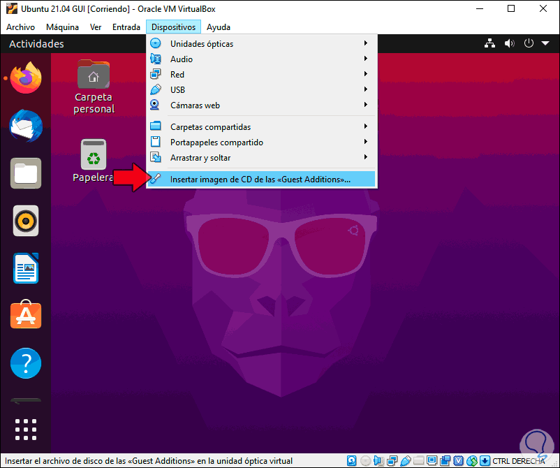 Una vez completo esto, en VirtualBox iremos al menú “Dispositivos” y allí seleccionamos la opción “Insertar imagen de CD de las <<Guest Additions>>”: