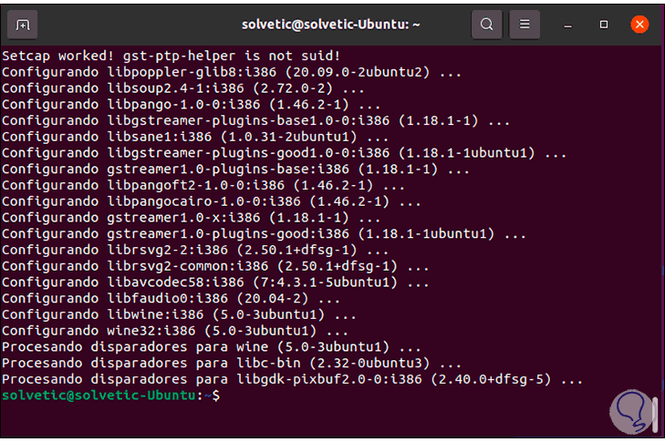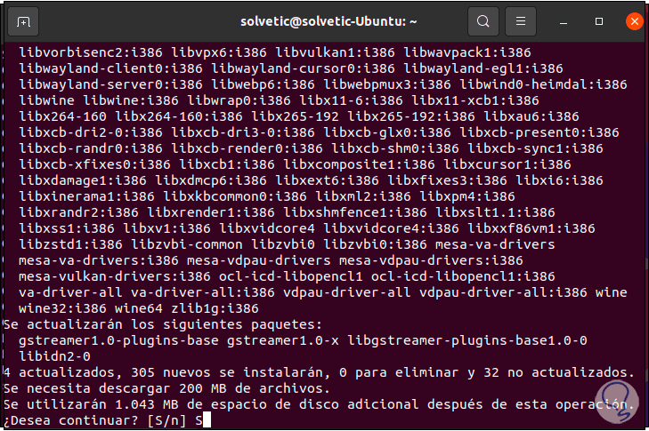 Debemos ingresar la letra S para confirmar la descarga e instalación de todos los paquetes de Wine en Ubuntu 21.04: