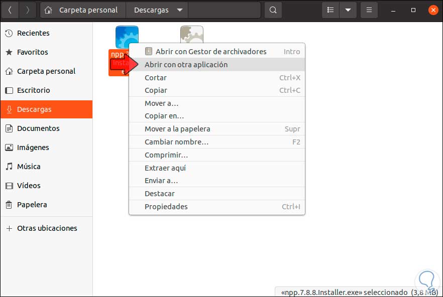 Dar clic derecho sobre el ejecutable y seleccionar “Abrir con otra aplicación”. Luego seleccionamos Wine.