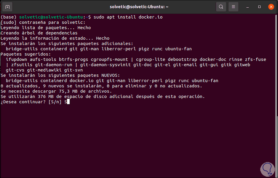 Ingresamos la letra S para confirmar la descarga e instalación de los paquetes de Docker: