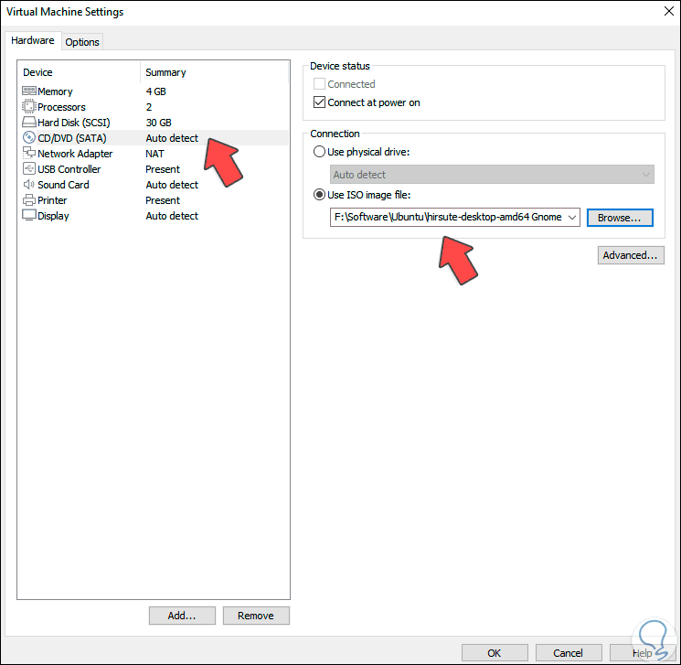 Damos clic en la línea “Edit virtual machine settings” y en la ventana desplegada vamos a la sección CD/DVD, activamos la casilla “Use ISO image file” y seleccionamos la imagen ISO que hemos descargado: