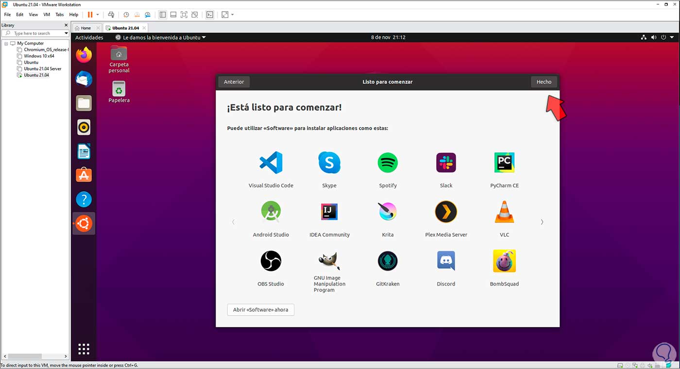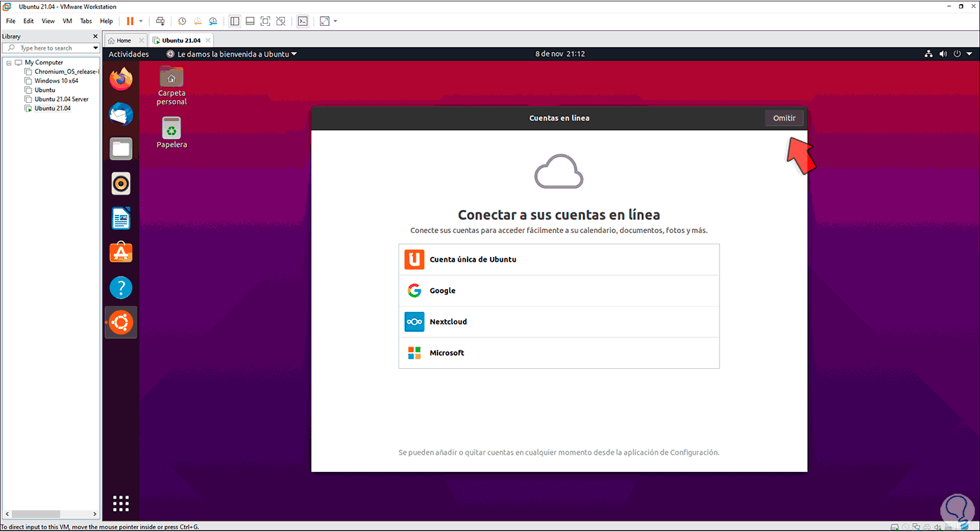 Al iniciar sesión debemos completar algunos para configurar Ubuntu 21.04: