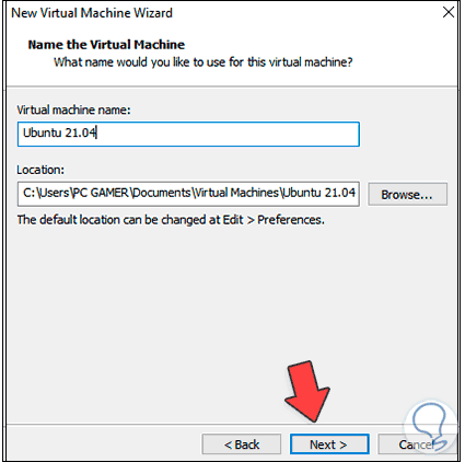 Damos clic en Next y ahora asignamos el nombre de la máquina virtual y la ruta donde se instalará: