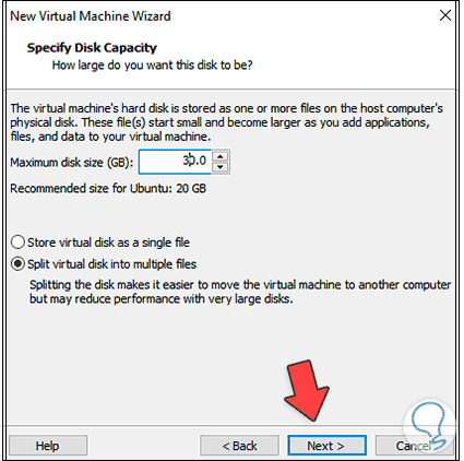 En la próxima ventana asignamos el tamaño del disco y el tipo de almacenamiento: