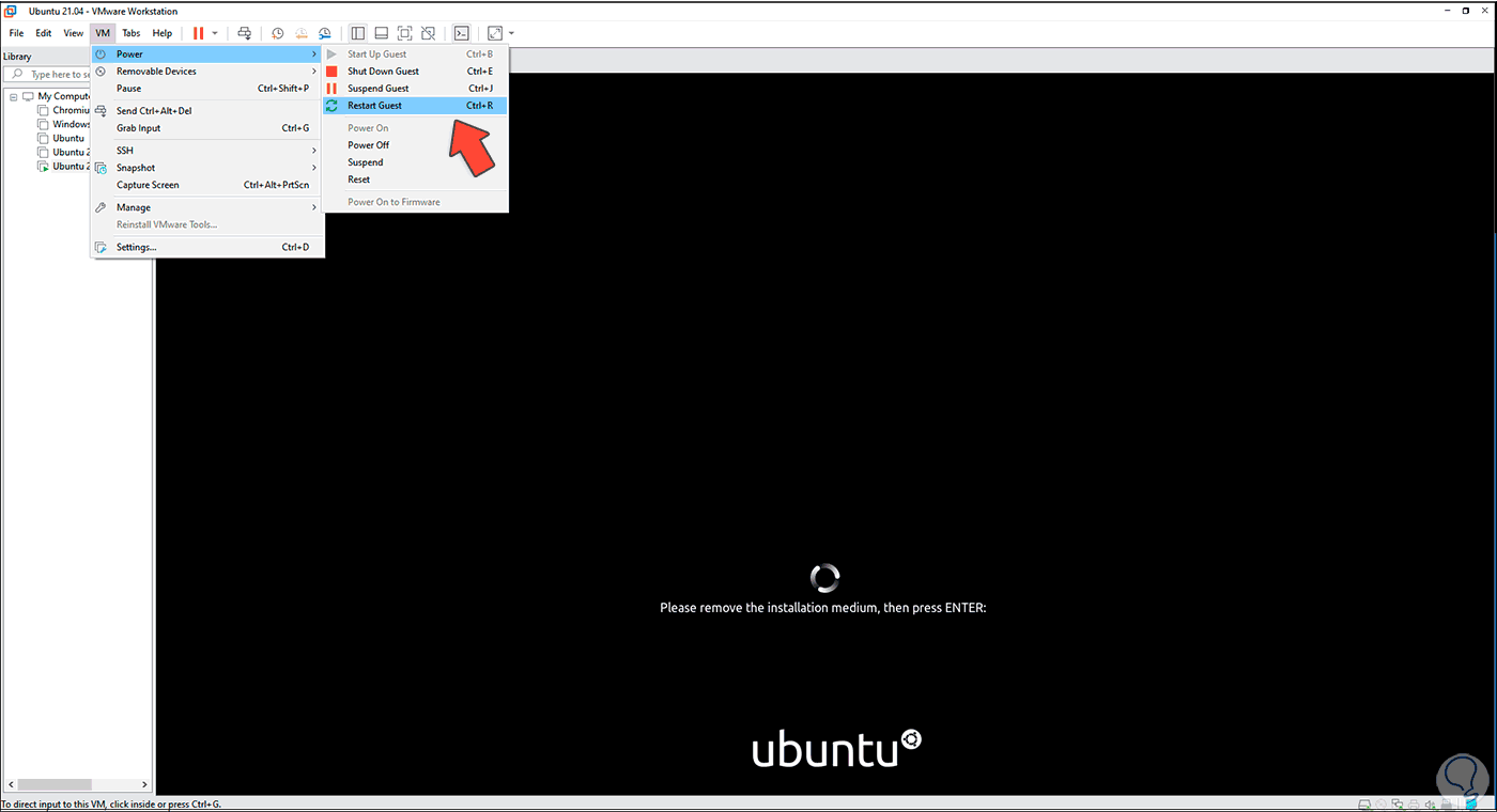 Para corregirlo damos clic en “VM – Power – Restart Guest”: