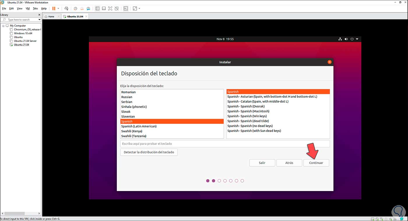 Después de esto definimos el idioma con el cual se instalará Ubuntu 21.04 en VMware: