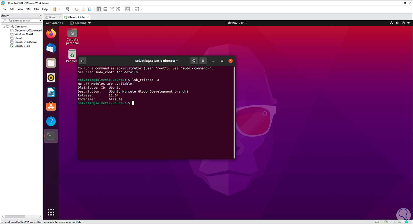 En VMware por defecto las VMware Tools se instalarán automáticamente durante el proceso, en la terminal comprobamos que se ha instalado Ubuntu 21.04 con el comando: