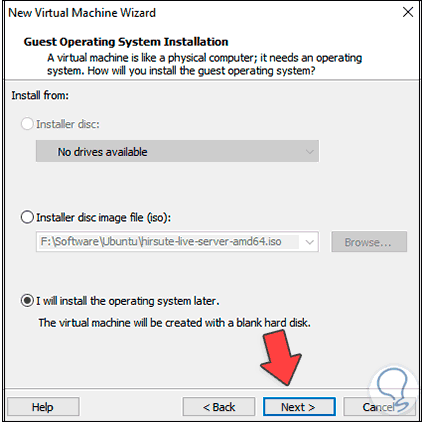 Dejamos la opción por defecto y en la siguiente ventana seleccionamos la opción “I will install the operating system later”: