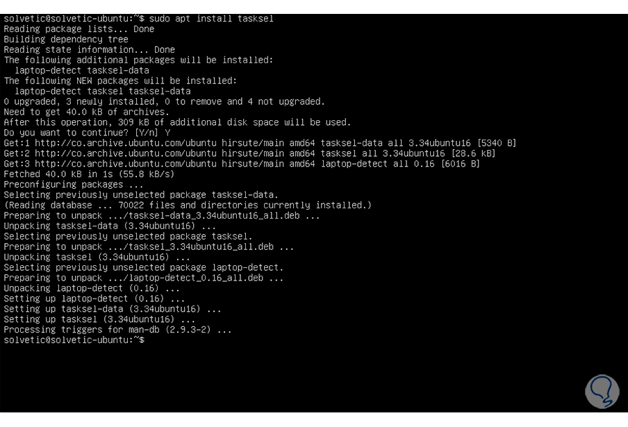 Ingresamos la letra Y para confirmar el proceso de descarga e instalación de Tasksel en Ubuntu Server 21.04: