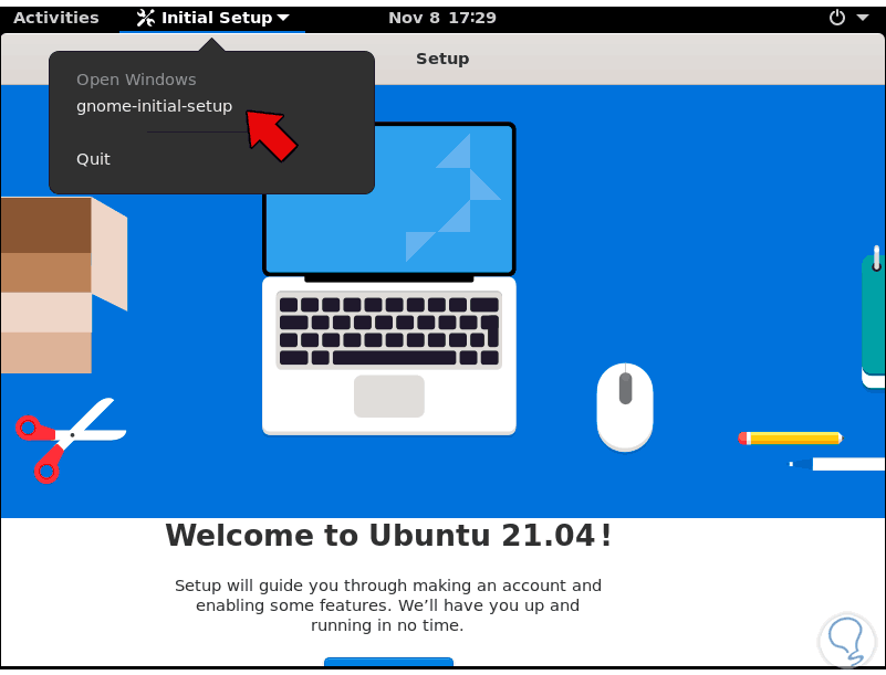 Vemos que se dará la bienvenida al entorno de Gnome en Ubuntu Server 21.04: