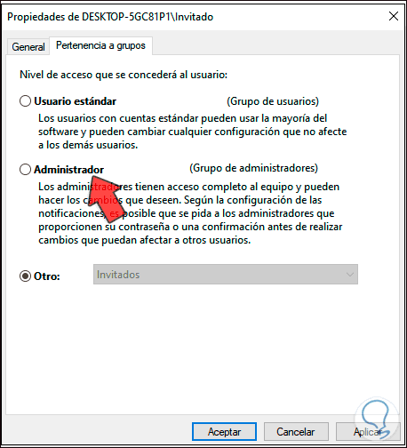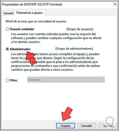 Damos clic en Aceptar para completar el proceso y de esta manera hemos editado los permisos del usuario Invitado a Administrador en Windows 10.