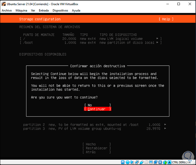 Damos clic en Hecho para iniciar la instalación de Ubuntu Server 21.04: