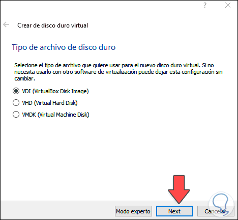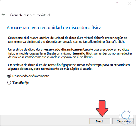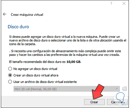Damos clic en “Crear”, definimos el tipo de disco duro a crear: