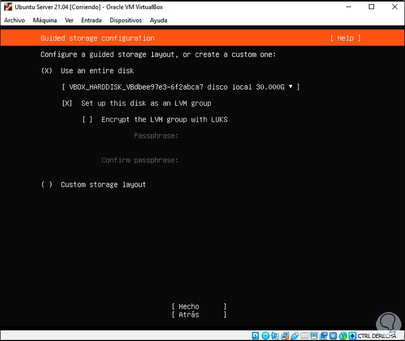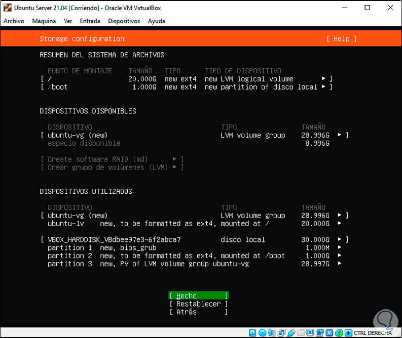 Clic en Hecho y accedemos a la configuración del disco para la instalación de Ubuntu Server 21.04: