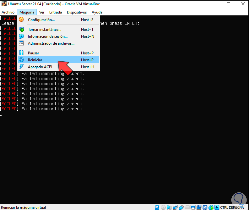 Para corregirlo, vamos al menú “Máquina – Reiniciar”:
