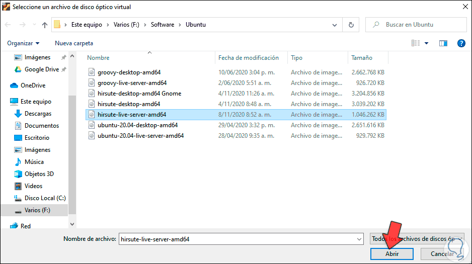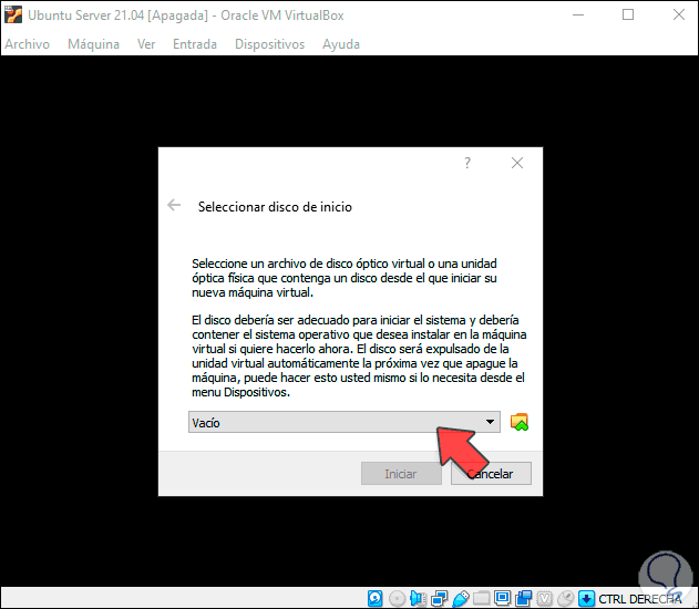 Damos clic en el botón para buscar la imagen ISO que hemos descargado de Ubuntu 21.04 Server, esta se encuentra disponible en el siguiente enlace: