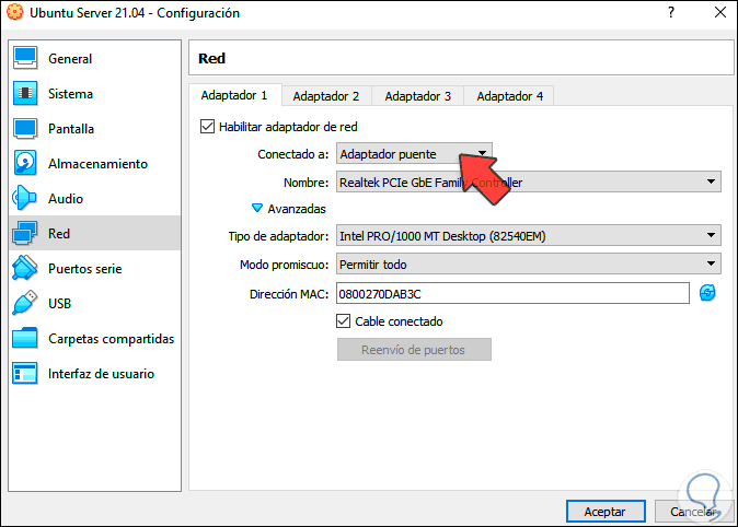Damos clic en el botón “Configuración” y debemos activar el adaptador de red, para ello en el campo “Conectado a “seleccionamos “Adaptador puente” y seleccionamos el adaptador de red físico: