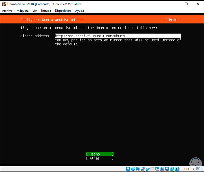 En la siguiente ventana confirmamos el espejo de Ubuntu Server: