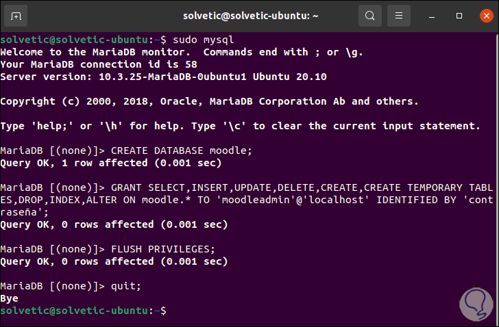 CREATE DATABASE moodle; GRANT SELECT,INSERT,UPDATE,DELETE,CREATE,CREATE TEMPORARY TABLES,DROP,INDEX,ALTER ON moodle.* TO 'moodleadmin'@'localhost' IDENTIFIED BY 'contraseña'; FLUSH PRIVILEGES; quit;