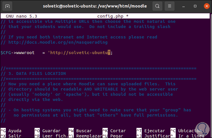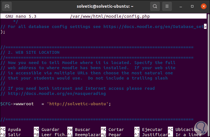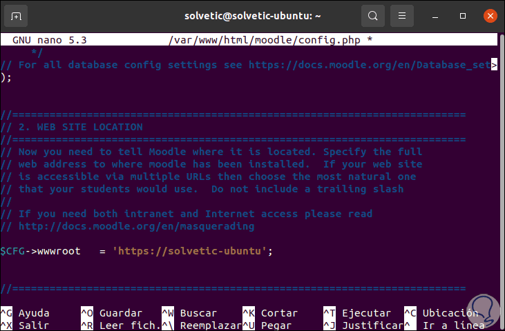 sudo nano /var/www/html/moodle/config.phpUbicamos la línea “CFG->wwwroot” :