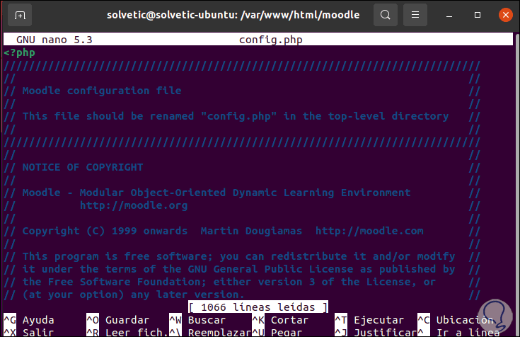 El siguiente paso será editar el archivo de configuración de Moodle, para esto ejecutamos lo siguiente:
