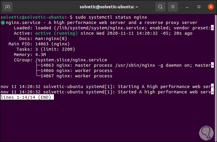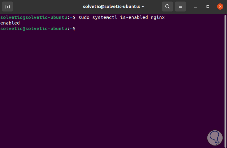 Vemos que su estado es activo y en ejecución, ahora habilitamos Nginx con el inicio de Linux:
