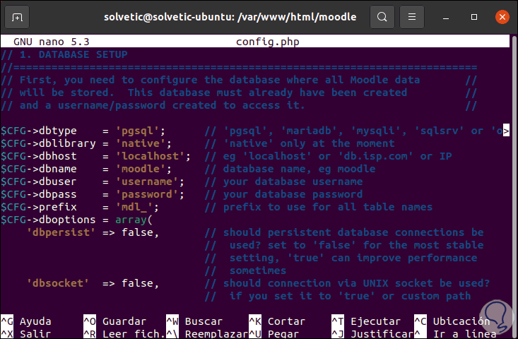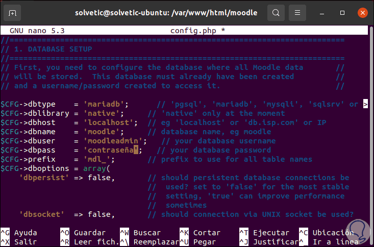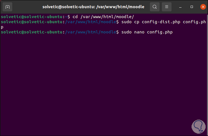 cd /var/www/html/moodle/ sudo cp config-dist.php config.php sudo nano config.php