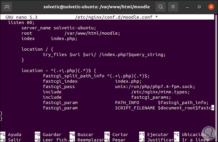 sudo nano /etc/nginx/conf.d/moodle.confAlli ingresamos la siguiente sintaxis: