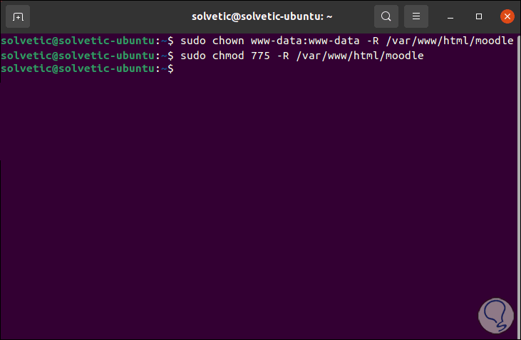 sudo chown www-data:www-data -R /var/www/html/moodle sudo chmod 775 -R /var/www/html/moodle