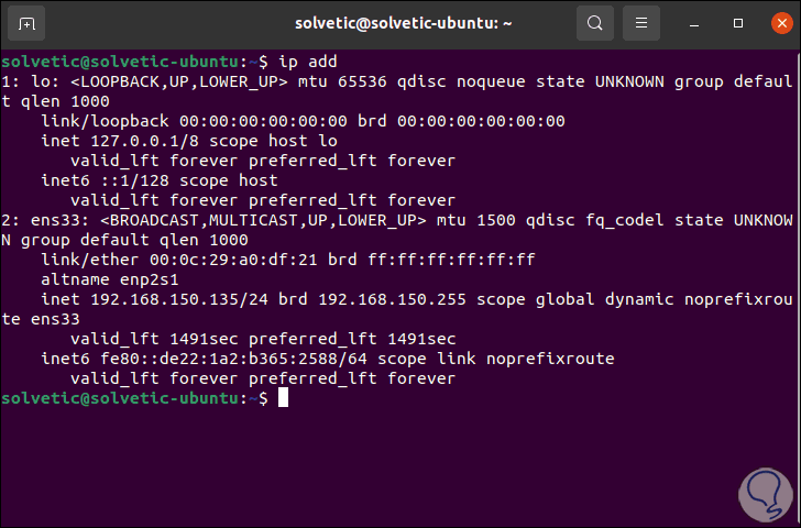 Ejecutamos el comando “ip add” para ver la dirección IP de Ubuntu 21.04: