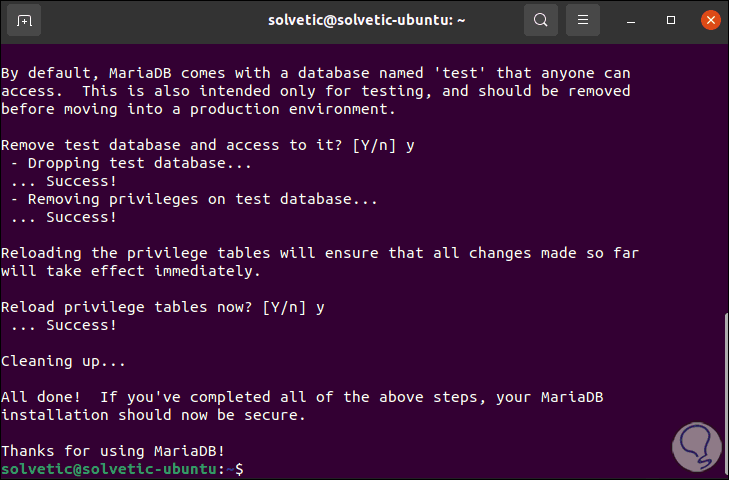 Es momento de asegurar la instalación de MariaDB ya que por defecto algunos parámetros son inseguros, para ello ejecutamos lo siguiente: