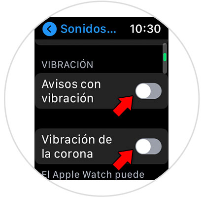 Un poco más abajo, desactiva las pestañas de “Avisos con vibración” y “Vibración de la corona”.