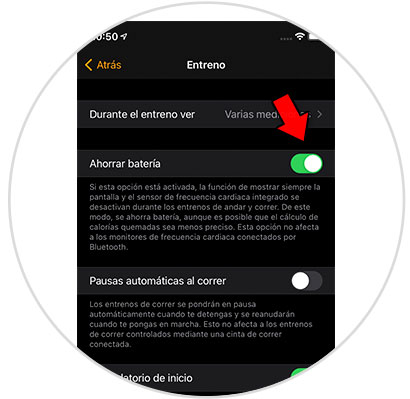 2. Activar “Ahorrar batería” en Entreno para ahorrar batería Apple Watch