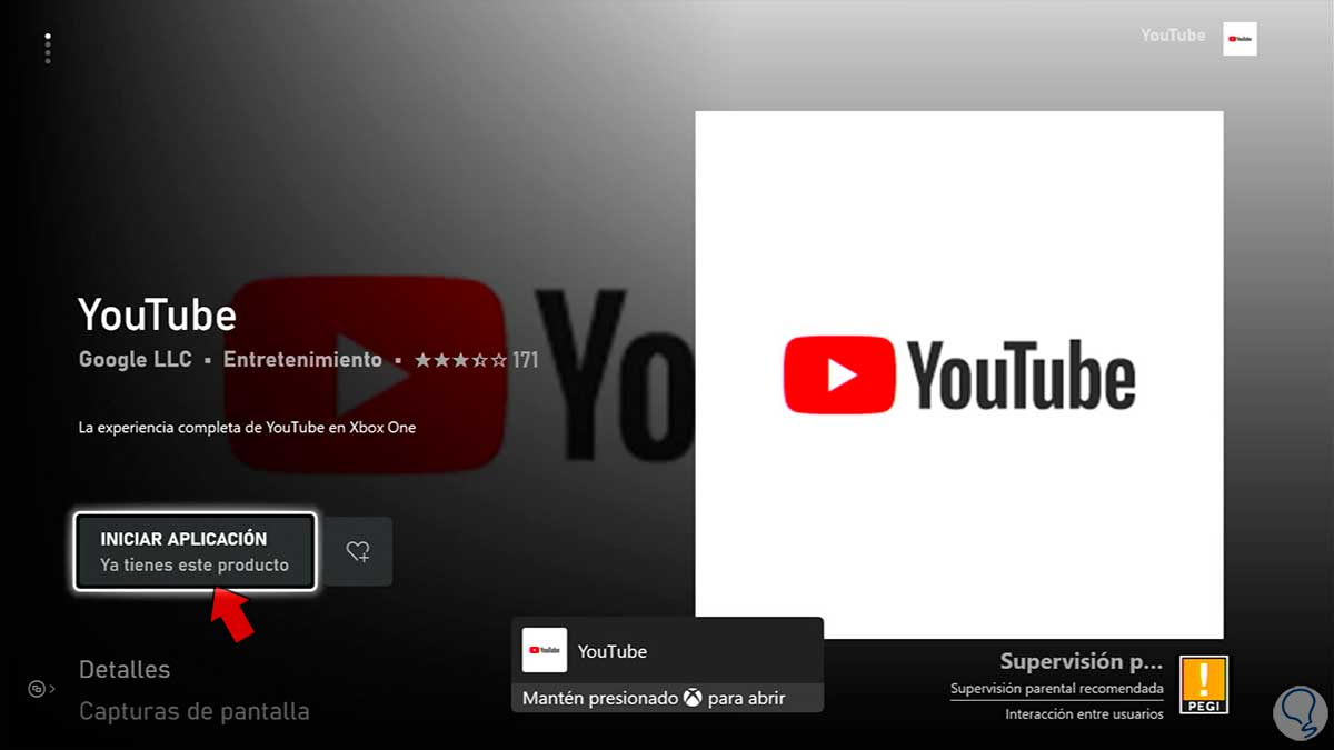 Una vez se ha completado la instalación, podremos abrir la aplicación de YouTube desde nuestro panel de aplicaciones o desde la pantalla que estamos viendo final pulsando en “Iniciar aplicación” o bien manteniendo pulsado el botón central con logo del mando.