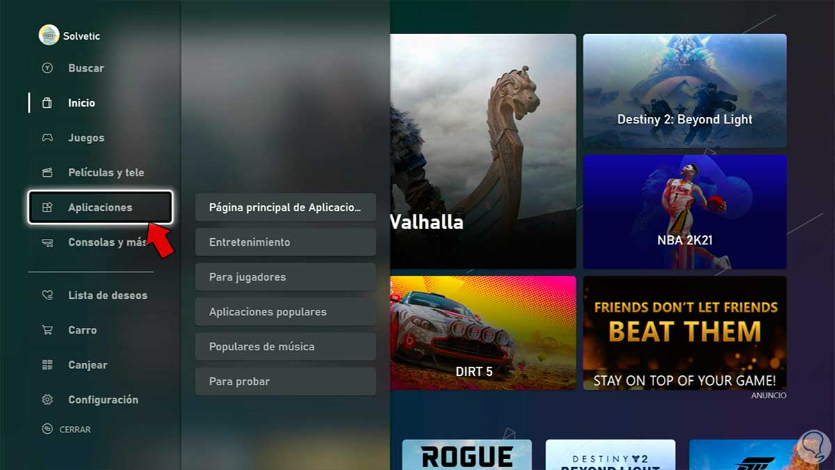 En esta ventana desplegamos el menú de la izquierda y elegimos la opción de “Aplicaciones” para ver más.