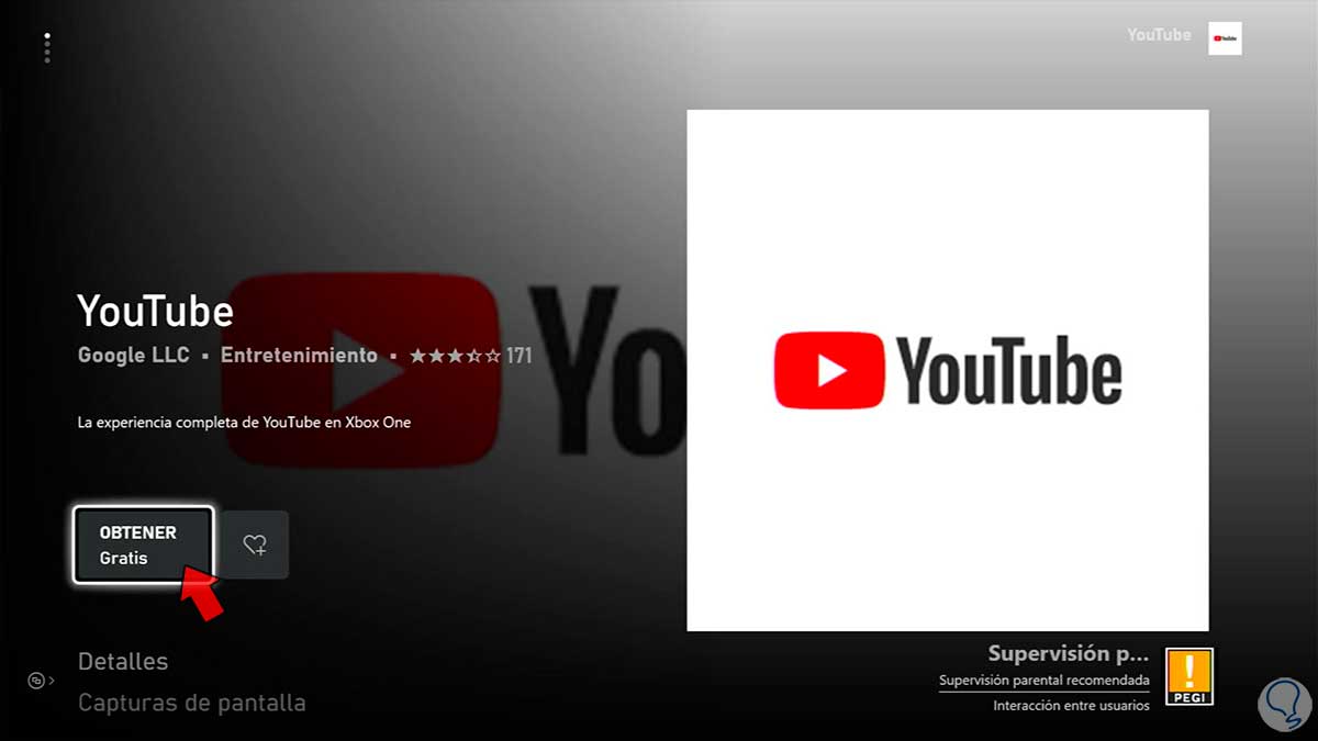 A continuación, tendrás que pulsar en la opción de “Obtener gratis” y comenzará la descarga e instalación de YouTube.