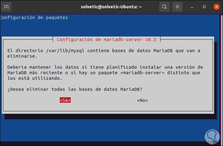 Ingresamos la letra S para confirmar este proceso de desinstalación de MariaDB, durante el proceso veremos el siguiente mensaje: