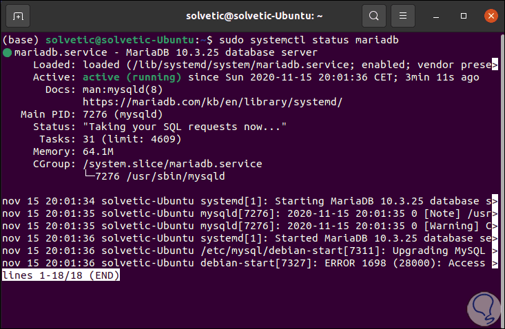Comprobamos el estado de MariaDB con el siguiente comando: