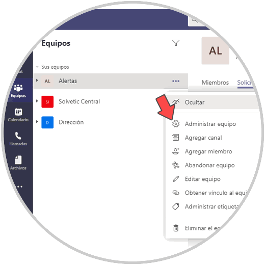 Damos clic sobre el menú contextual del equipo a editar (tres puntos horizontales) y en las opciones desplegadas damos clic en “Administrar equipo”: