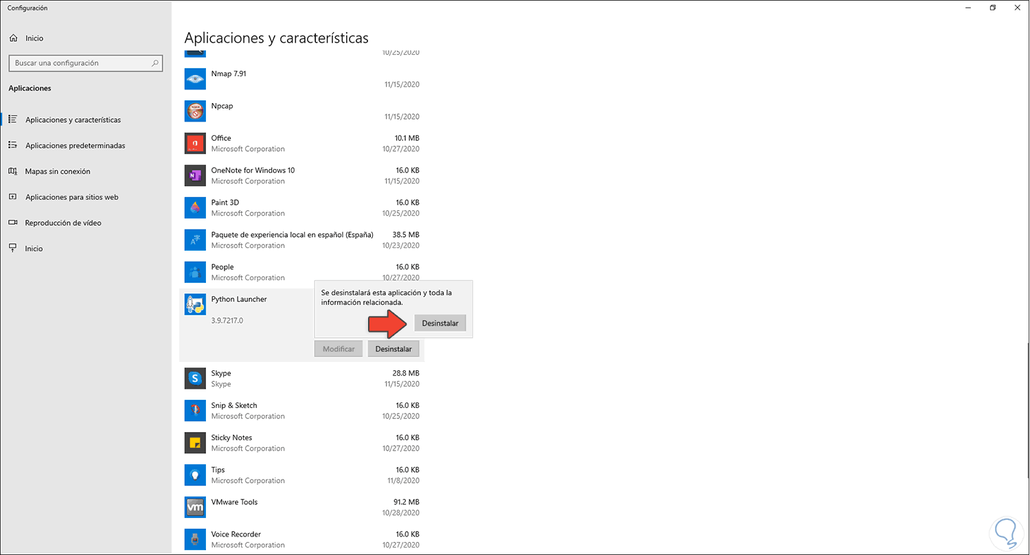 Ahora damos clic sobre “Python Launcher” y de nuevo damos clic en Desinstalar dos veces: