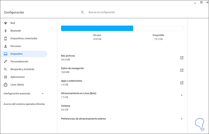 Allí encontramos el estado real del almacenamiento de Chromebook: