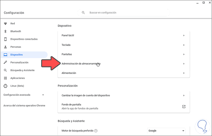 En la configuración de Chromebook iremos a “Dispositivo” y allí encontramos la sección “Administración de almacenamiento”:
