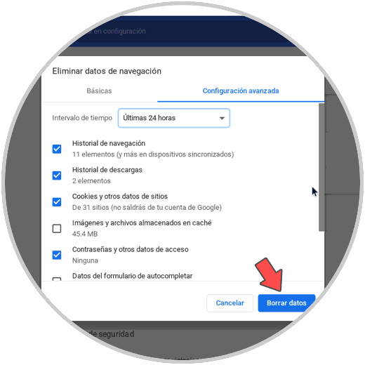 Activamos las casillas deseadas así como el rango de tiempo y damos clic en “Borrar datos” para proceder con la operación: